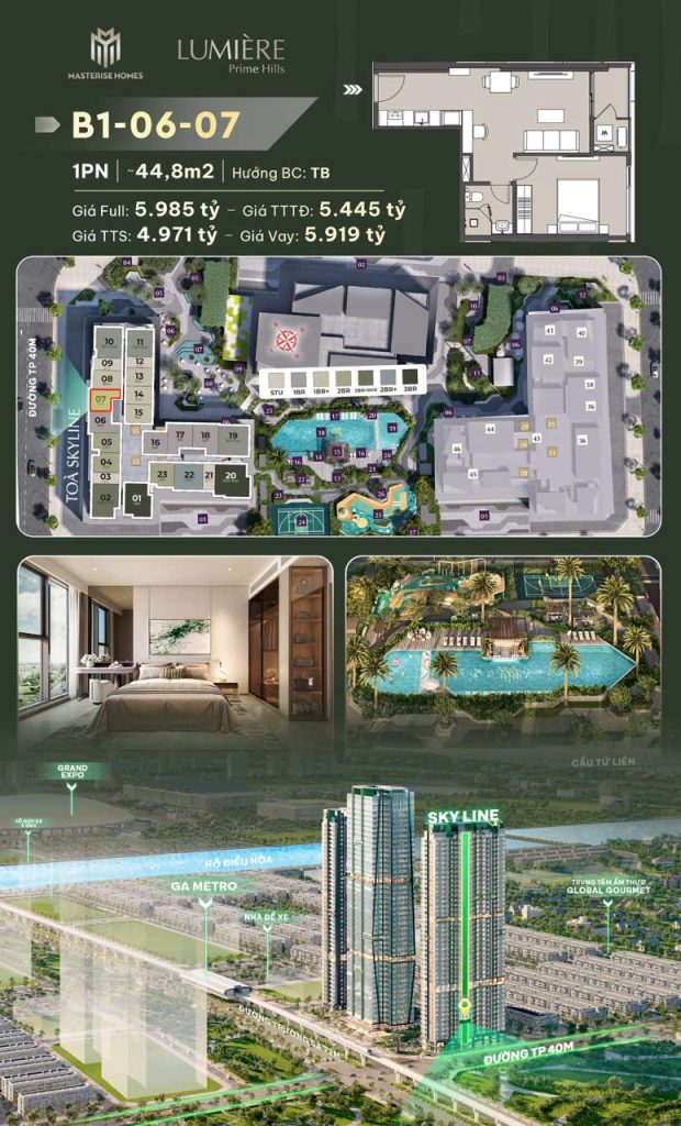 Lumiere Prime Hills chính thức ra mắt hai tòa tháp đầu tiên – P1 và P2, cao 45 tầng với thiết kế chữ L độc đáo, gồm 3 tầng hầm, 9 thang máy tốc độ cao, 21 căn hộ mỗi sàn, và vị trí liền kề hai nhà để xe nổi, tối ưu sự tiện lợi trong vận hành và di chuyển. Dự án cung cấp 1.640 căn hộ cao cấp, đa dạng loại hình từ studio, 1PN+, 2PN, đến 3PN, với diện tích linh hoạt từ 33,5m² đến 112m², phù hợp với mọi nhu cầu: người trẻ độc thân, gia đình nhỏ, hộ gia đình đa thế hệ hay nhà đầu tư dài hạn.